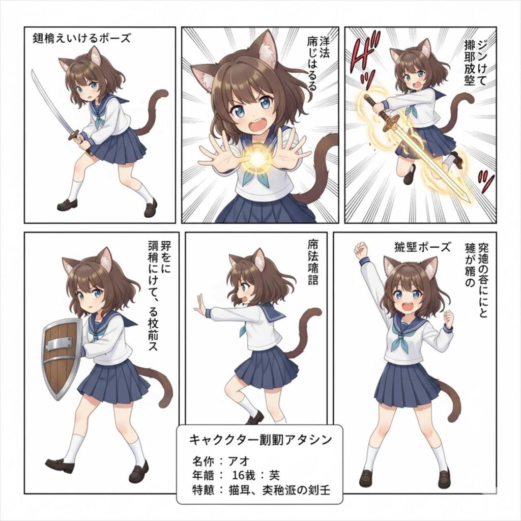 「nano-banana」は、Googleが作った画像生成AI「Gemini 2.5 Flash Image」の愛称です。このツールのすごいところは、同じキャラクターの「顔」や「特徴」を覚えて、色々なポーズや表情、衣装で描いてくれることなんです!
