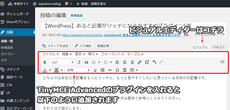TinyMCE Advanced は、記事を投稿編集する時のビジュアルエディターを強化することができるプラグインです。