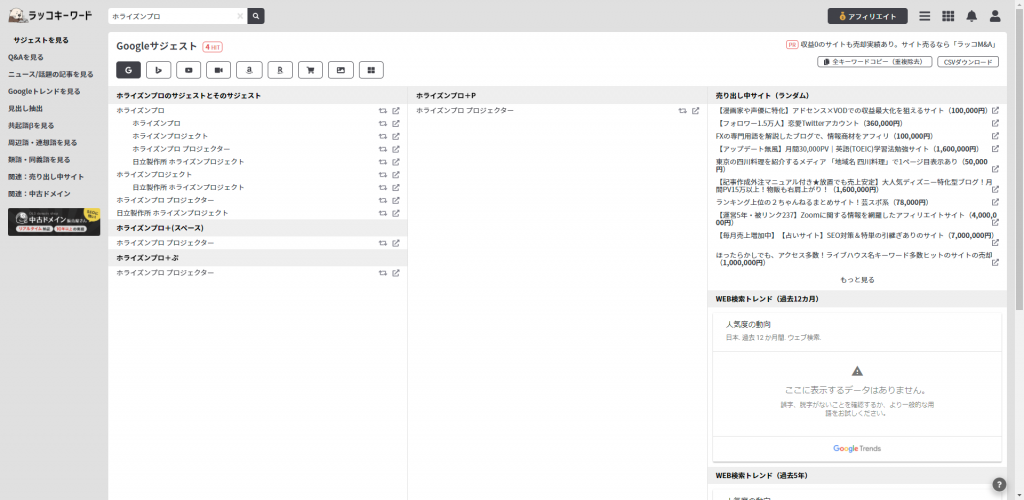 そんな時は、ラッコキーワードを使ってよく検索されるキーワードを見つけます。