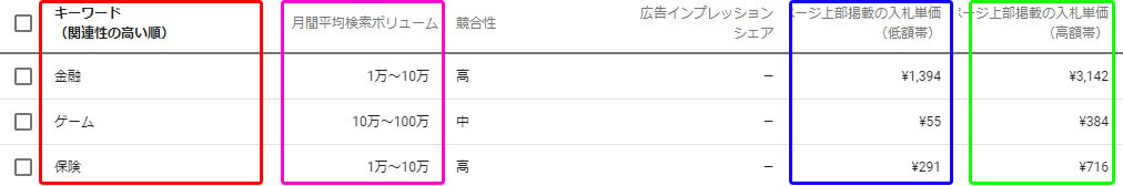 「ページ上部に表示された広告の入札単価」には、過去に対象のキーワードでページ上部に広告を表示した広告主様の単価実績の中で、単価が示されます。低額帯と高額帯。