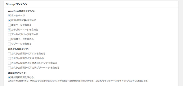 設定方法は、左側の「設定」から「XML Sitemaps」を選択すると設定することができます。