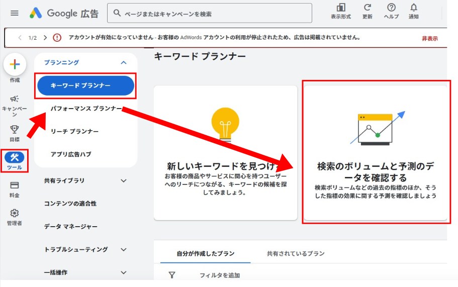 キーワードの検索ボリュームがわかるキーワードプランナー。