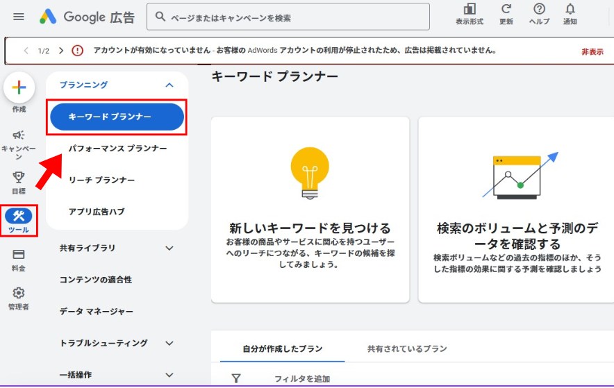 - メニューが表示されるので一番左の「キーワードプランナー」を選択
