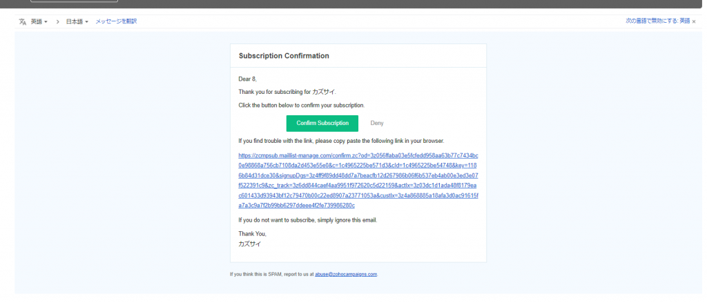 zoho campaignsの登録フォームに登録すると届く同意確認メール。