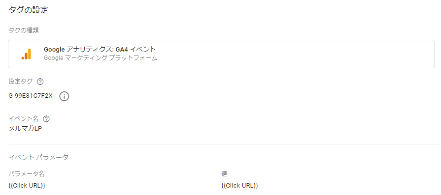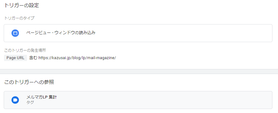 トリガーの設定は、対象のページのURLのウィンドウの読み込みが完了したら発火する設定にしました。