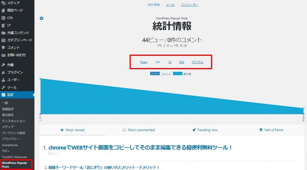 | Hall of Fame | プラグインを設定してから累計「ビュー数」と「コメント数」がソートされて確認できます。 |
